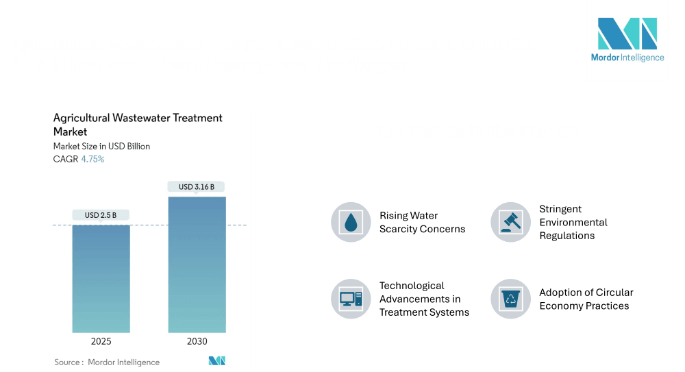 According to the latest Mordor Intelligence analysis, the Agricultural Wastewater Treatment Market Size is projected to grow from an estimated USD 2.50 billion in 2025 to USD 3.16 billion by 2030, representing a compound annual growth rate (CAGR) of around 4.75 %. This upward trajectory is propelled by deepening concerns over dwindling freshwater supplies and escalating agricultural water demand.