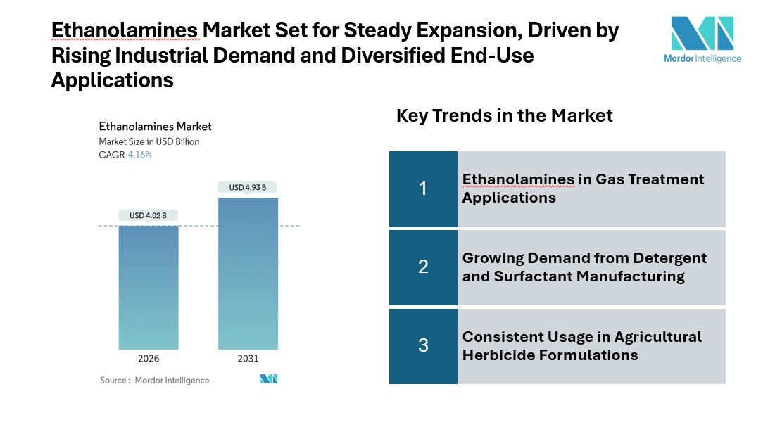 The ethanolamines market size was valued at $ 4.02 Billion in 2026 and is projected to reach USD 4.93 Billion by 2031, growing at CAGR of 4.16%. Ethanolamines are key intermediates in herbicide and agrochemical formulations – demand here is rising with global agricultural productivity needs. There’s a growing trend toward bio-based ethanolamines and greener production routes, partly due to environmental policies and consumer demand for sustainable chemicals.