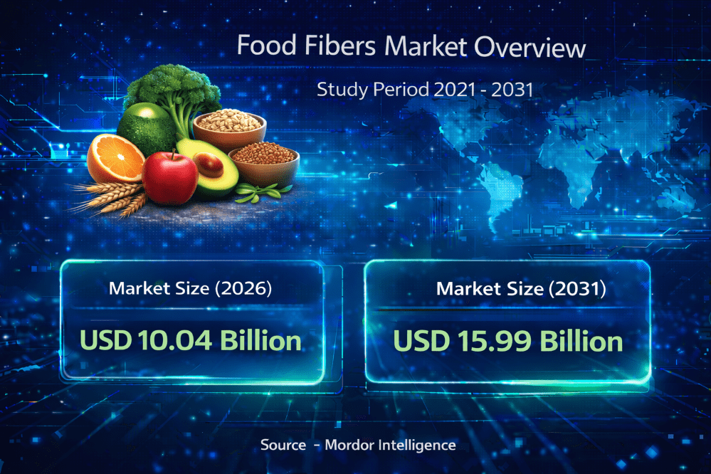 According to a research report by Mordor Intelligence, the global food fibers market size is projected to grow from USD 10.04 billion in 2026 to USD 15.99 billion by 2031, reflecting strong momentum during the forecast period. The expanding food fibers market growth is supported by increasing awareness of dietary fiber intake, sugar-reduction regulations, and rising consumer focus on gut health and metabolic wellness.