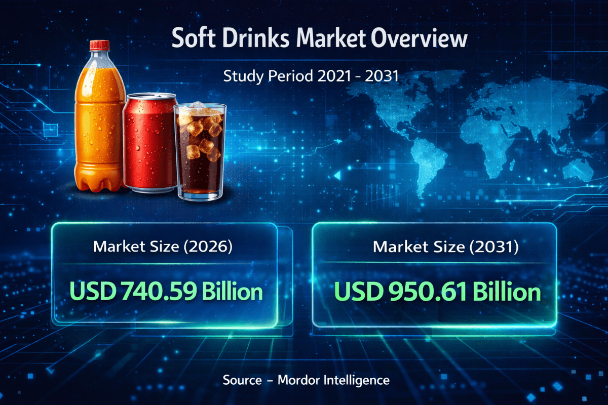 The global soft drinks market size is projected to grow from USD 740.59 billion in 2026 to USD 950.61 billion by 2031, reflecting a CAGR of 5.12% during the forecast period. Market growth is increasingly shaped by health-conscious consumption patterns, regulatory sugar controls, and demand for functional and clean-label beverage options.