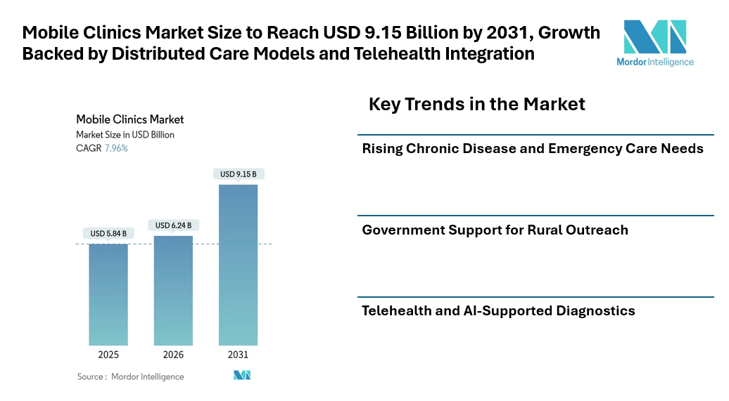 According to Mordor Intelligence, the mobile clinics market size is projected to grow from USD 5.84 billion in 2025 to USD 6.24 billion in 2026 and is expected to reach USD 9.15 billion by 2031, registering a CAGR of 7.96% during the forecast period.