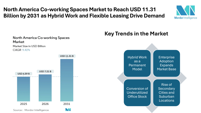 According to Mordor Intelligence, the North America co-working spaces market size was valued at USD 6.59 billion in 2025 and is estimated at USD 7.21 billion in 2026, projected to reach USD 11.31 billion by 2031, growing at a CAGR of 9.42%. This market growth reflects structural changes in how organizations use office space, especially as hybrid work becomes a long-term model rather than a temporary solution. Companies are prioritizing flexibility, cost control, and access to distributed talent, which is strengthening the North America co-working spaces industry across major cities as well as suburban locations.