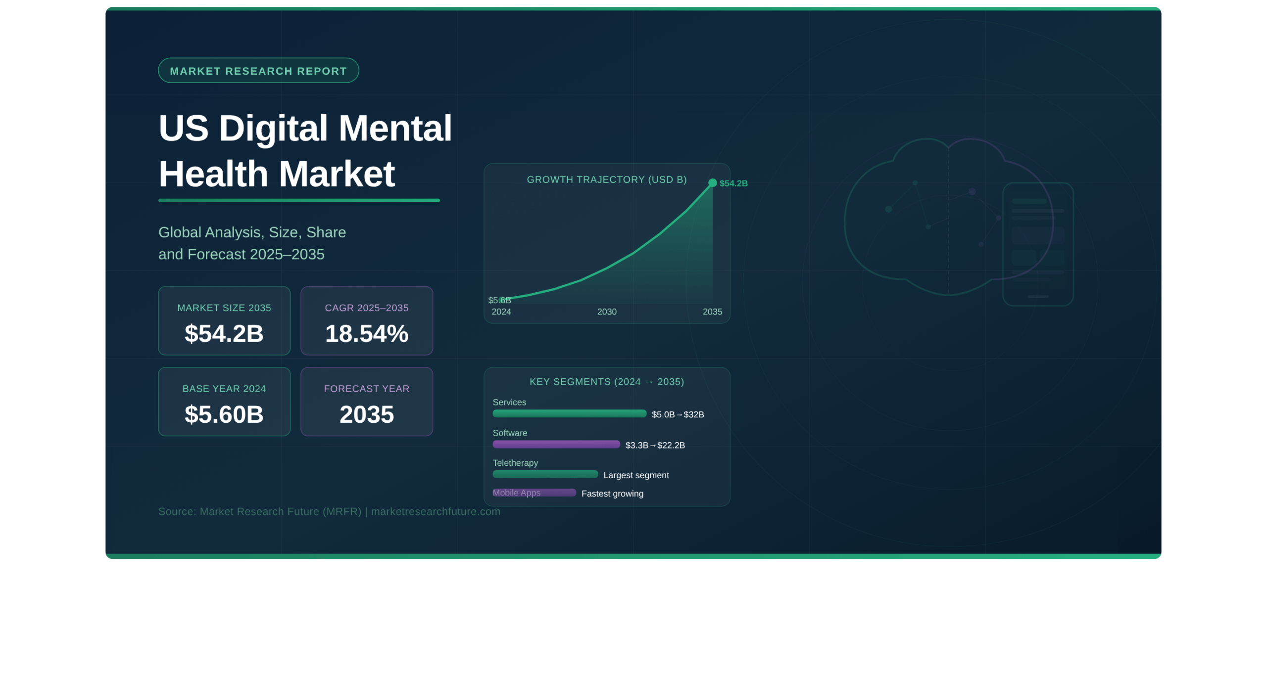 According to MRFR analysis, the US Digital Mental Health Market size reached USD 5.60 billion in 2024, with the Software component valued at USD 3.34 billion and the Services component at USD 5.0 billion. By 2035, the Software segment alone is projected to reach USD 22.16 billion, while Services are expected to expand to USD 32.0 billion — reflecting a fundamental shift in how Americans access, receive, and manage mental healthcare. The market sits at a powerful intersection of healthcare, technology, and social awareness, driven by growing recognition that mental health is as critical as physical health in determining overall quality of life.